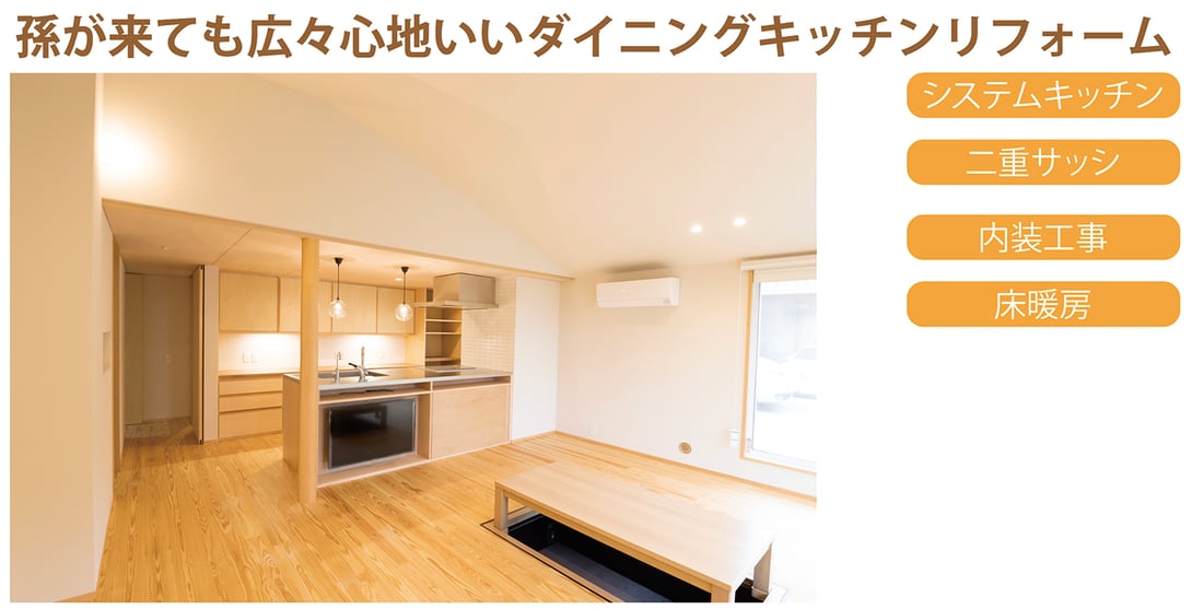 別々だったキッチンとダイニングをつなげたり、堀コタツを取り込んだりしてLDKを一体化し、広々とした1つの空間しました。冷暖房がよく効く二重サッシに入れ替え、芯から温まる床暖房も取り入れました。
