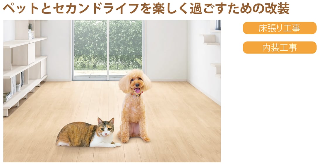 子供たちも家を離れ、夫婦が二人きりとなると何か寂しいもの。セカンドライフを楽しく過ごすためにペットと一緒に暮らす方は多いと思います。ダイケンからペット床材が人気です。愛犬の足腰にやさしく猫の吐き戻しなどに配慮し、汚れにも強いいペット用床材です。また汚れ、傷付き、ニオイの染み込みに強い壁材もあります。ペットとの関係が今まで以上に良好になり、ペットともセカンドライフが楽しくなります。